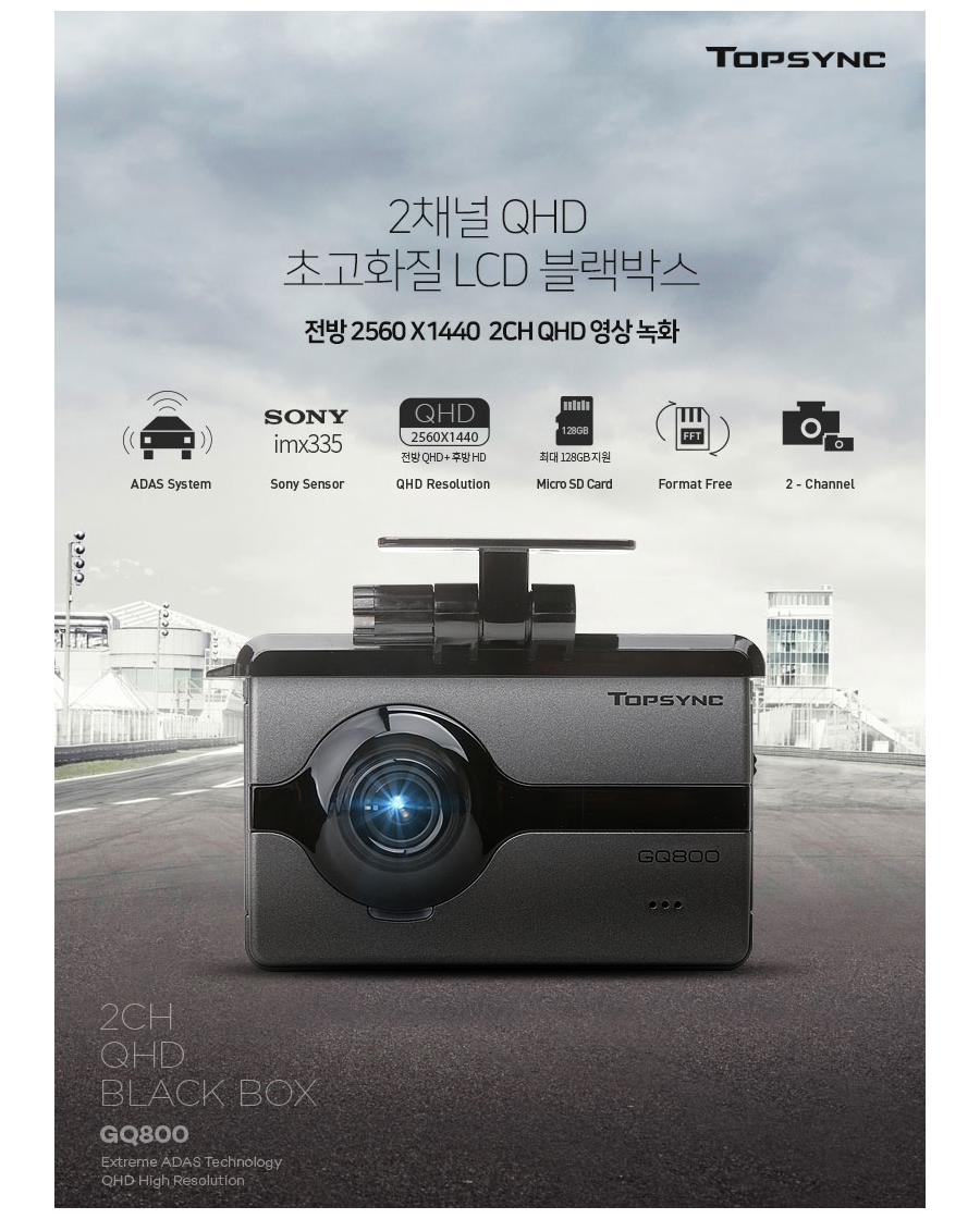 전방 2560 x 1440 2CH QHD를 지원하는 블랙박스로 탑싱크 'GQ800' 블랙박스입니다.
